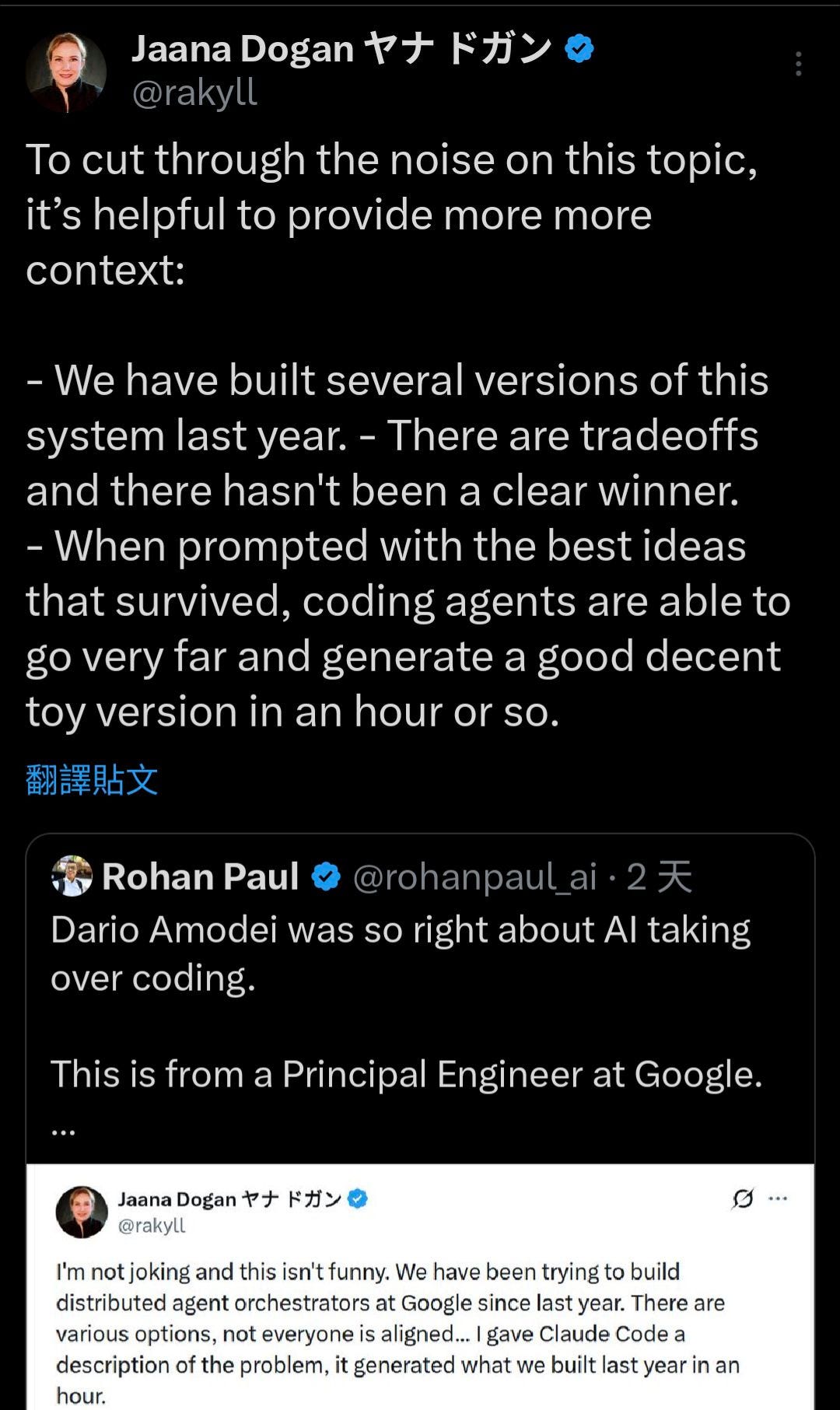這是這幾天戰成一片的推文,Google 首席工程師 Jaana Dogan(網名 @rakyll)提到她使用 Anthropic 的開發工具「Claude Code」重現了團隊一年的工作成果。